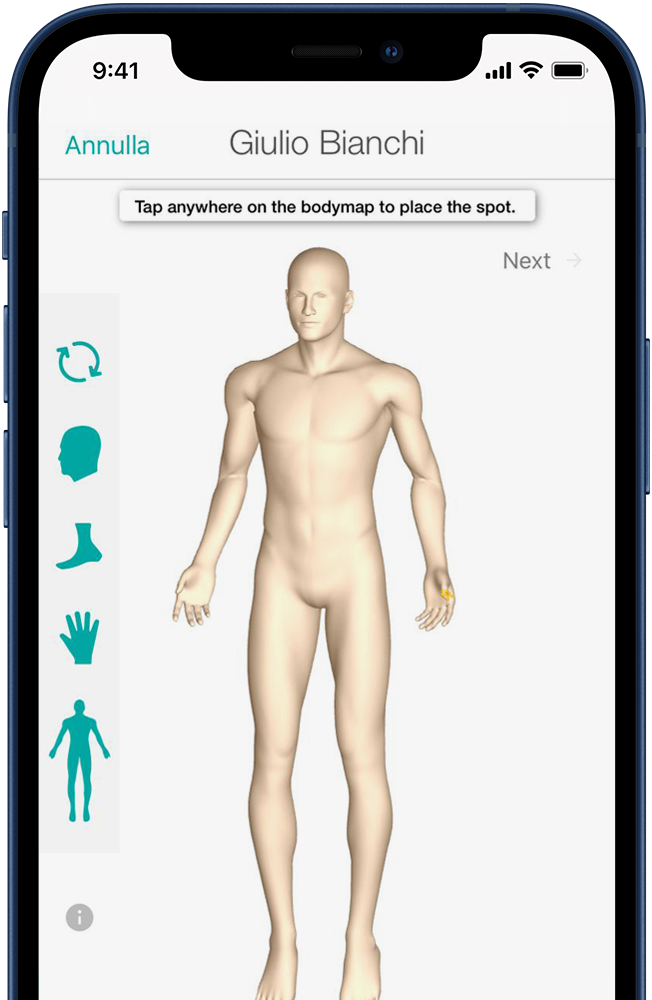 Scelta della Body Map 3D dell’area da esaminare e acquisizione delle immagini panoramiche.