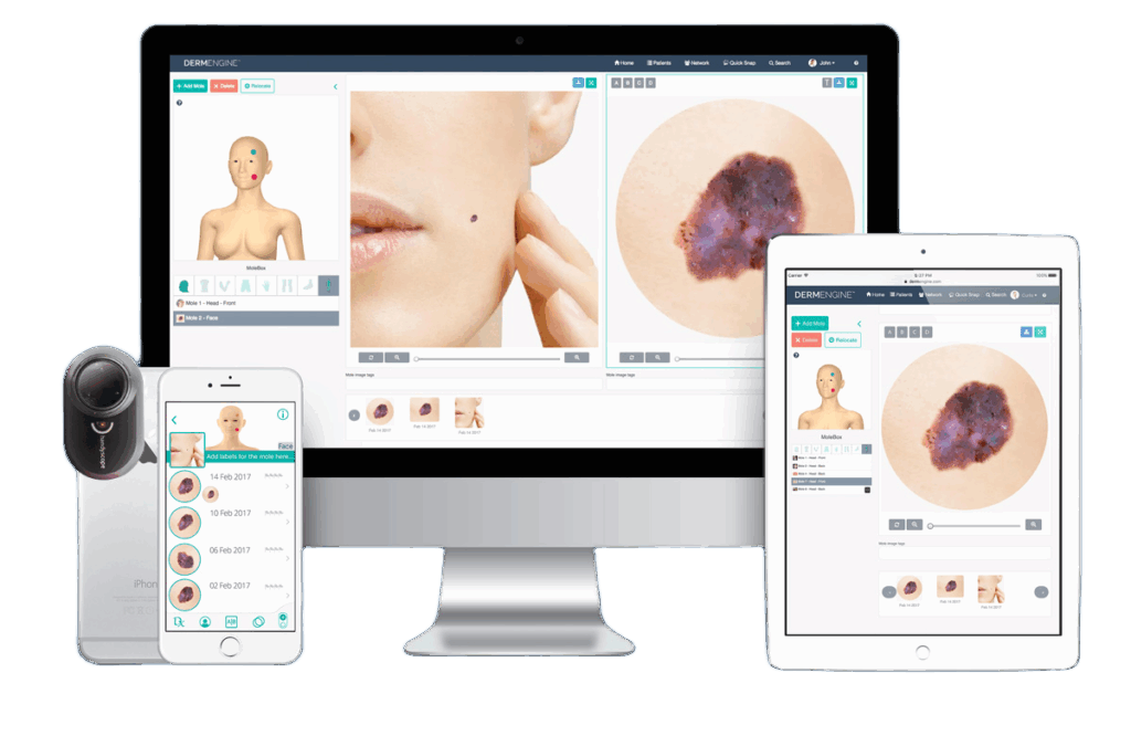 L’ecosistema multipiattaforma permette di gestire in modo completo il profilo del paziente, organizzando le immagini dermatoscopiche raccolte e offrendo strumenti di analisi avanzata basati su algoritmi AI.